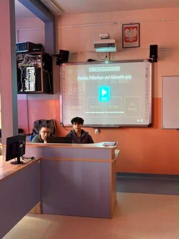 Grupa uczniów klasy 8a wzięła udział w pracy nad projektem „ Od słowa do quizu” pod kierunkiem nauczycielek: p. Ewy Sołtysiak (jez. niemiecki) i p. Wioletty Szwebs (informatyki). Jego realizacja przebiegała etapami. W dniu 28.11.2025 podsumowaliśmy naszą współpracę. Uczniowie w trzyosobowych grupach tworzyli quizy edukacyjne (Kahoot , Wordwall) na wylosowany temat wraz z zagadnieniem gramatycznym w języku niemieckim. Główny cel projektu to uchwycenie nauczanych treści w atrakcyjny sposób dla młodzieży wykorzystując ich umiejętności językowe oraz interaktywne. Poza tym utworzyli zasoby cyfrowe, które są bazą powtórzenia określonego materiału dla innych. Inicjatywa wzbudziła wiele pozytywnych emocji i jest dowodem na to, że nauka to nie tylko obowiązek, ale i przyjemność.