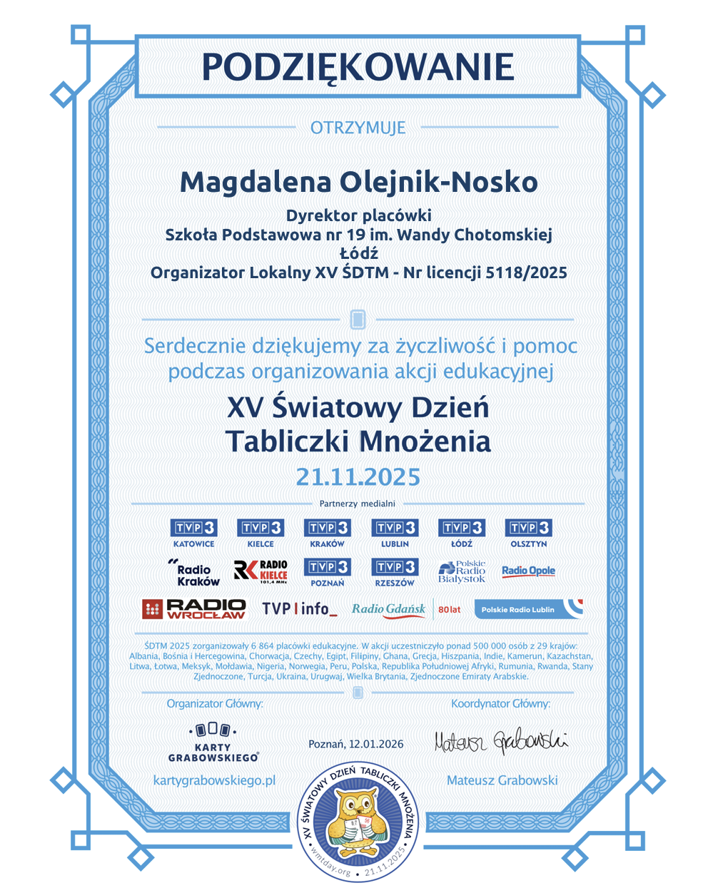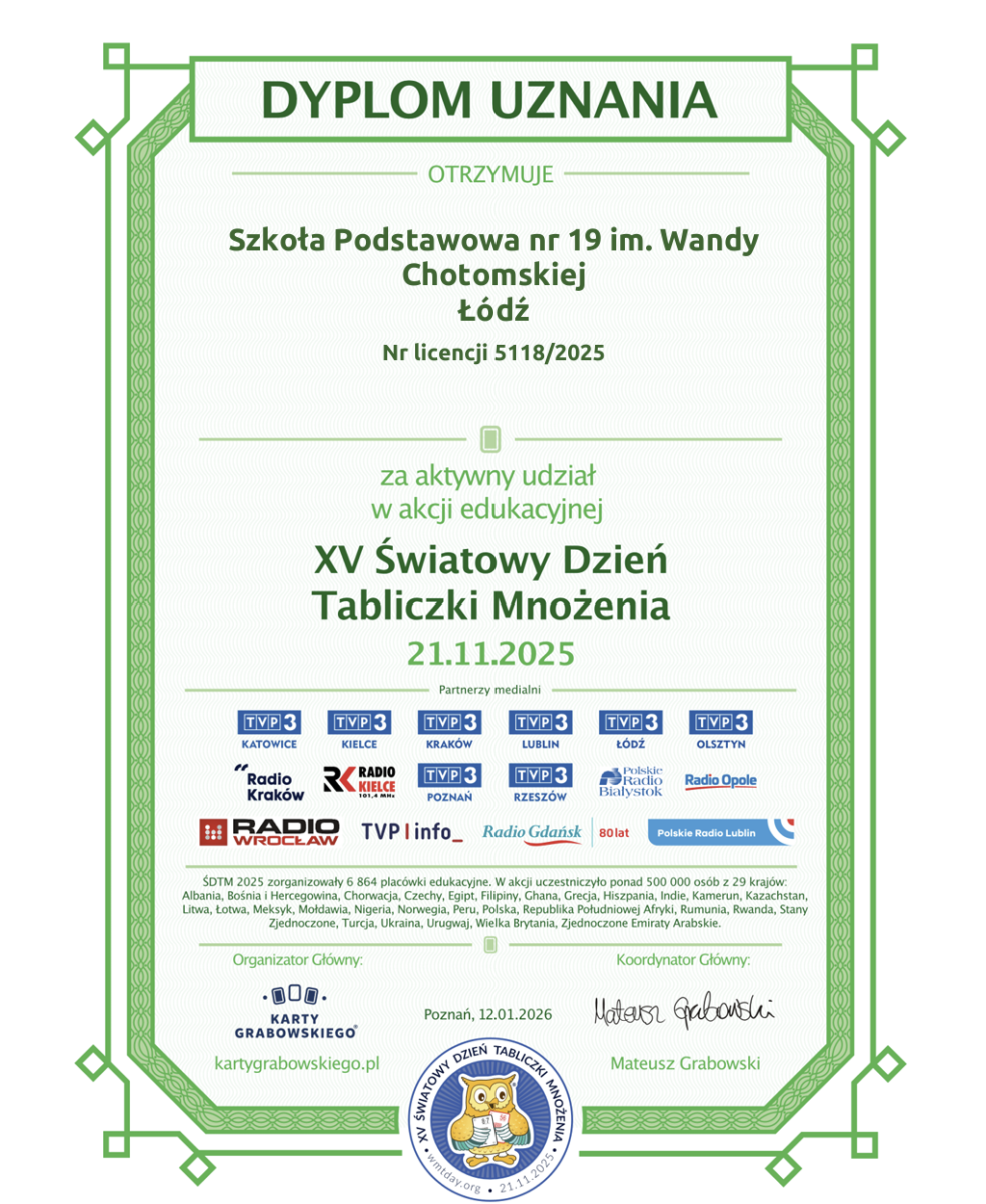 W listopadzie 2025 r. nasza szkoła po raz kolejny uczestniczyła w akcji Światowy Dzień Tabliczki Mnożenia. Dzisiaj dotarły do nas certyfikaty potwierdzające udział naszej szkoły w tej inicjatywie.